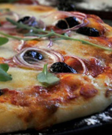 A l'aide d'une pelle à pizza ou avec vos main, faites glissez la pizza sur la Pizza Stone bien chaude. Laissez cuire 12minutes à 250°C.
