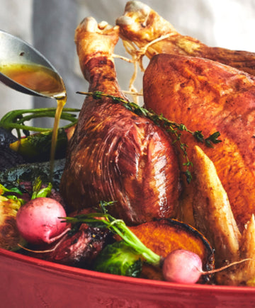 Salez l’intérieur du poulet et garnissez avec la farce. Placez-le dans la Brique à rôtir et disposez les pommes de terre et les petits légumes autour. Enfournez pendant 1h30 à four préchauffé à 200°C.