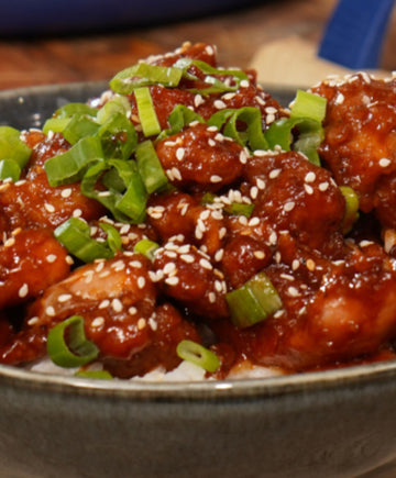 Faire chauffer la Fabuleuse poêle vide sur feu moyen, verser un filet d'huile et faire revenir une minute l'ail. Ajouter la marinade et laisser frémir 4 minutes jusqu'à ce qu'elle épaississe légèrement. Ajouter le poulet dans la Fabuleuse et remuer délicatement pour enrober le poulet de sauce. Laisser cuire 2 minutes. Enfin retirer du feu et saupoudrer de graines de sésame et d'oignons verts émincés. Servir le poulet frit chaud accompagné de riz cuit.