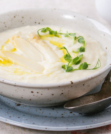 Versez l'huile d'olive dans une sauteuse et faites revenir l'oignon. Dès qu'ils sont translucides, déglacez avec le vin blanc. Quand il s'est évaporé, ajoutez les pommes de terre et les asperges. Ajoutez le bouillon et laissez mijoter à couvert pendant 20 minutes.