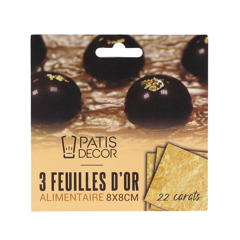 3 feuilles d'or alimentaire 22 carats 8x8cm Patisdecor