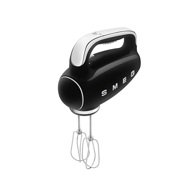 Optez pour le BATTEUR À MAIN NOIR ANNÉES 50 de SMEG, combinant style et performance. Avec 9 vitesses, fonction Turbo, écran LED, et accessoires en inox, il garantit un mélange parfait et une utilisation confortable.