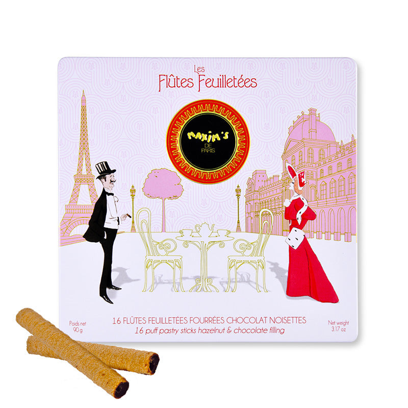 Boite métal 16 flûtes feuilletées chocolat noisettes Maxim's