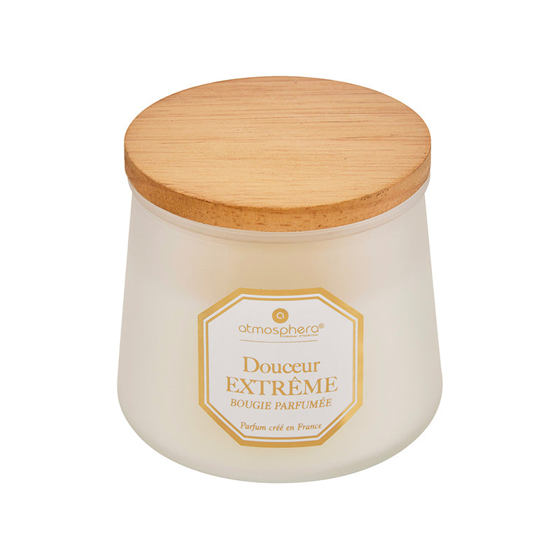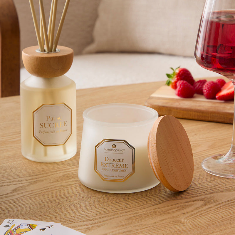 Découvrez la bougie parfumée Elisa Douceur d'ATMOSPHERA. Son verre dépoli et son couvercle en bois préservent la fragrance délicate, idéale pour envelopper votre espace d'une atmosphère cocooning et chaleureuse. Un indispensable pour une ambiance réconfortante.