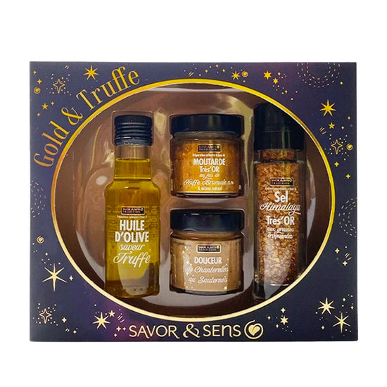 SAVOR & SENS, maison d'épicerie fine située dans le Var à Signes, se distingue par ses créations haut de gamme et ses emballages à la fois raffinés et originaux. Ce coffret Gold & Truffe est l'idée cadeau par excellence pour marquer toutes les occasions, offrant une escapade sensorielle unique. Faites plaisir à vos proches ou régaler vos invités en leur offrant ce coffret de saveurs aussi authentiques que prestigieuses.