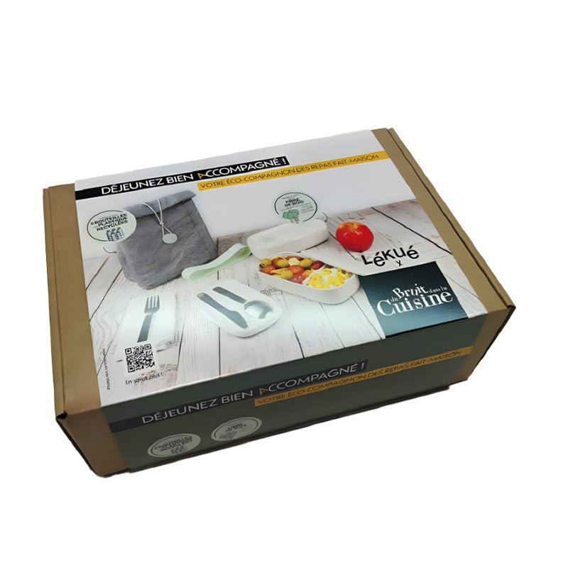 Comprenant une lunch box de 2 compartiments de 500ml, un sac de transport isotherme et un set de couverts en inox, ce coffret eco-responsable est principalement composé de matières recyclées, provenant de l’industrie forestière ou de bouteilles en plastique. Pour un repas en extérieur 100% écologique !