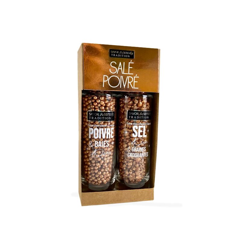 Ce coffret contient des épices originales proposées dans deux pots en verre élégants. Le premier vous permet d’assaisonner vos plats avec du sel de l'Himalaya et des graines croquantes. Le second pot contient du poivre blanc et des baies idéaux pour relever le goût de vos plats. Les deux épices peuvent être utilisées lors de la préparation de vos plats ou à table comme assaisonnement supplémentaire. Dans les deux cas, l’aspect doré apportera un côté festif à toutes vos recettes.