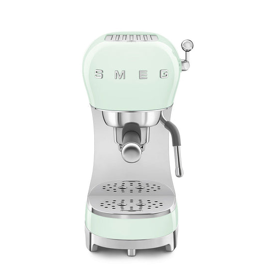 Découvrez la machine à café expresso vert d'eau années 50 par SMEG. Dotée de la technologie Thermoblock et d'une pompe de 15 bar, elle garantit un expresso parfait. Compacte et élégante, elle s'adapte à toute cuisine. Fabriquée en Italie.